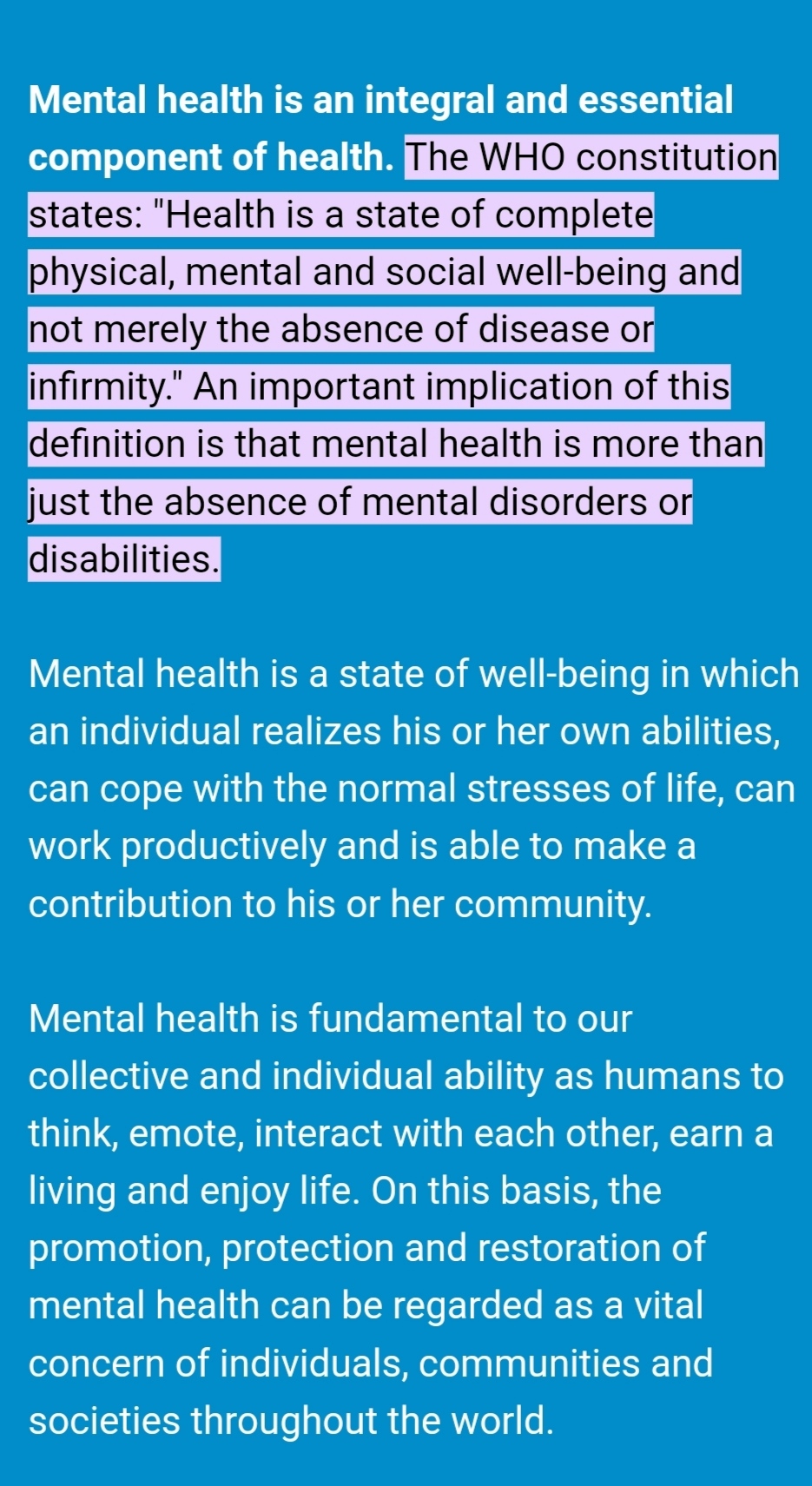 Therefore it’s essential to understand the effects of the Mind over Matter(Body). Mental health is an essential dimension of Health because the state of one’s Mind effects one’s physiological processes also. Good Health is most important for all Human tasks, devoid a moderate Health at least, individual is unable to perform Physical, Mental, Intellectual or Social tasks.